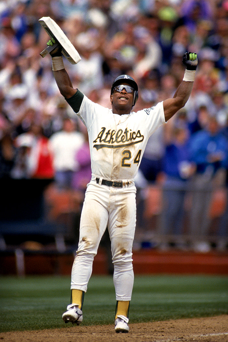 Hall of Famer Rickey Henderson lifts third base after breaking the base stealing record formerly held by Lou Brock. The photograph was taken in Oakland, California.